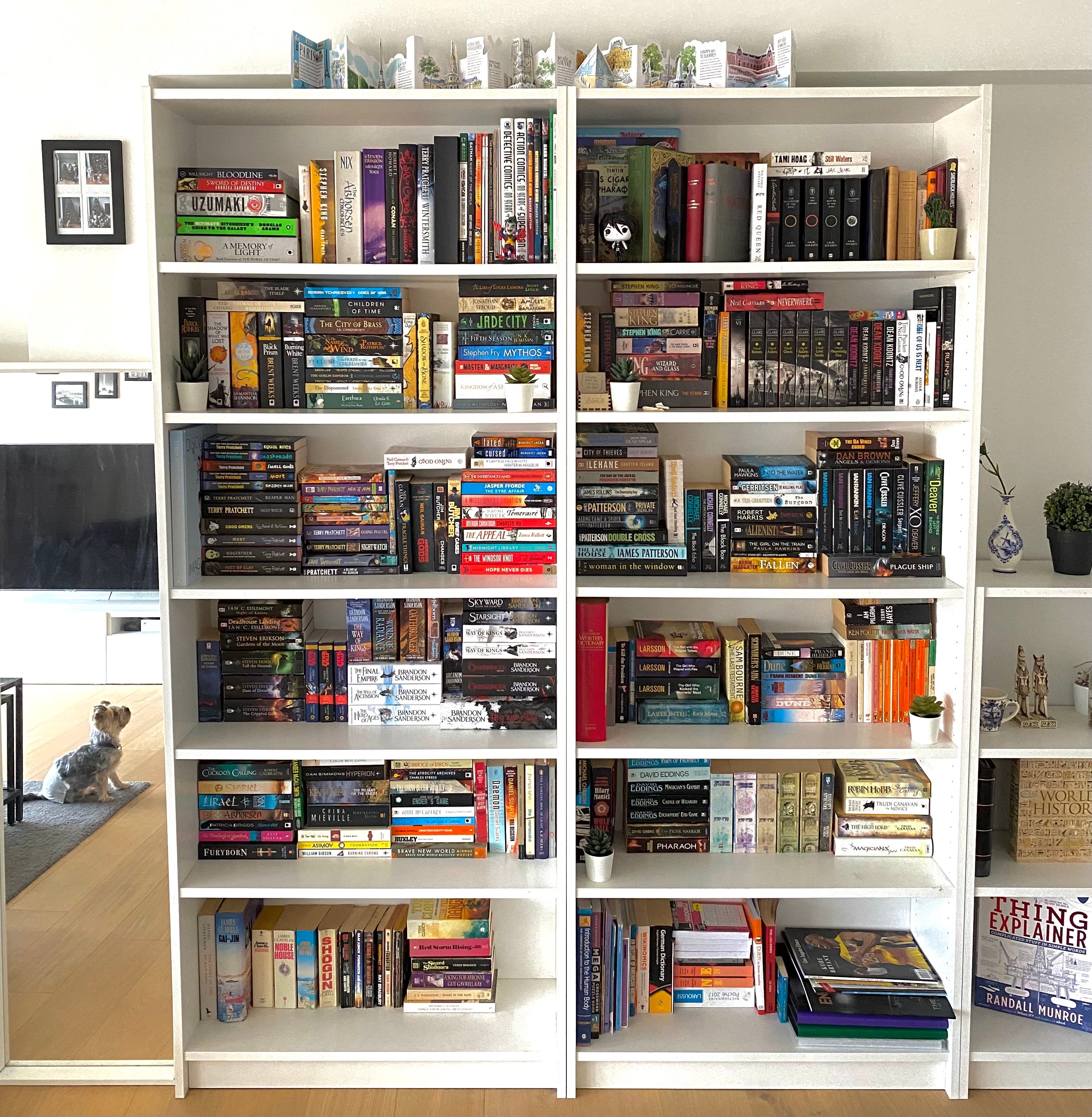 Organized my bookshelf this last week. Also spent some time cataloging what I have because I don’t want to end up with multiple copies of the same book (there are only so many copies of Good Omens one can have). Here's a pic of the result. No particular plan for the organization as such. I've tried to keep books from the same author together but that pretty much immediately fell apart. What we ended up with is a mish-mash of everything everywhere just trying to depict some semblance of order.