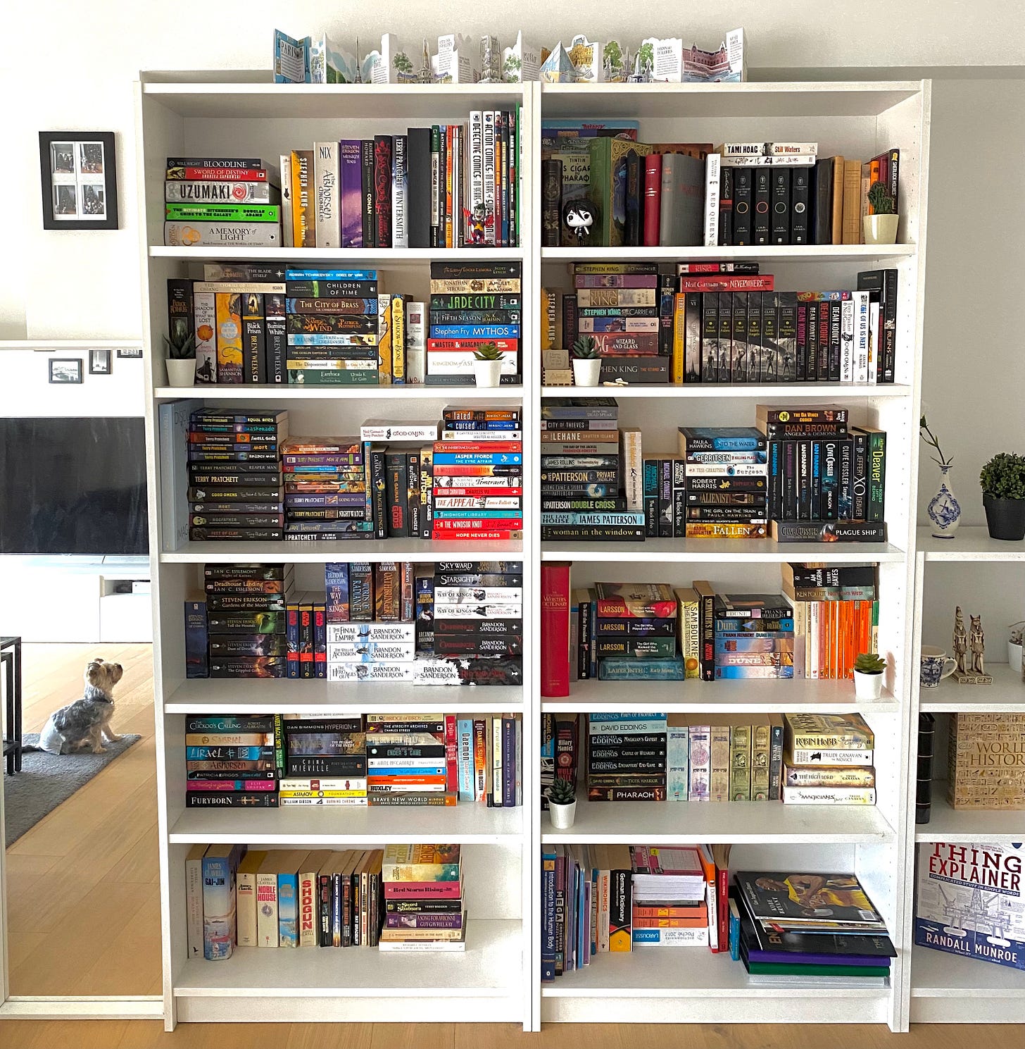 We also have Tony pictured in the mirror there, patiently waiting for me to get done so that I can give him some attention. How do you organize your bookshelves? Let me know!